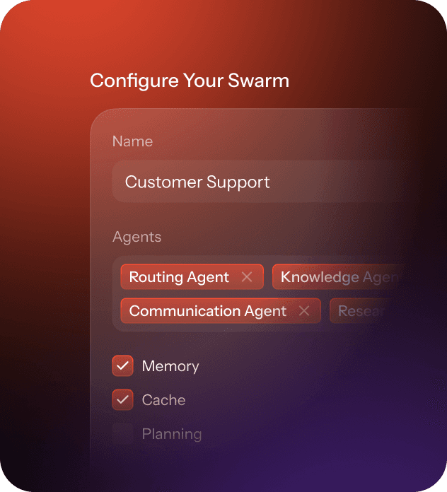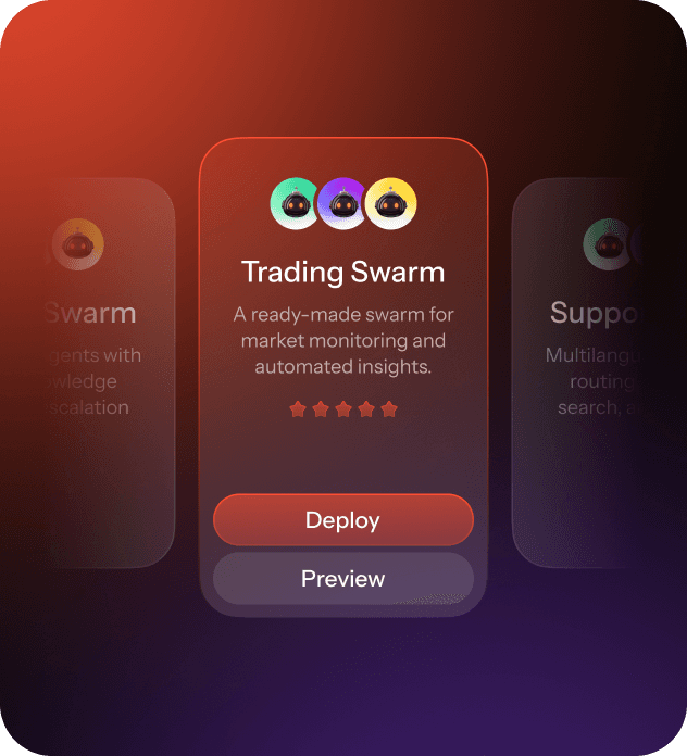 Launch swarms in Discord, Telegram, web, or via API, and list them in the marketplace.